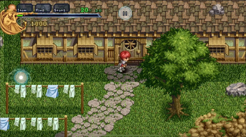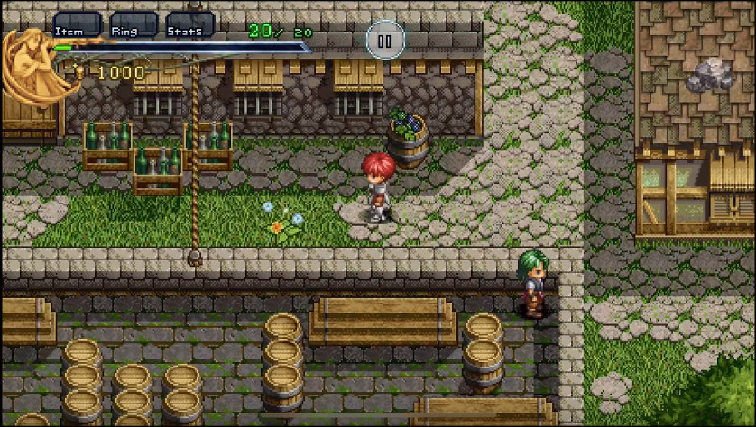 越过一大片的草原(这时亚特鲁身上没有任何的装备和武器,只有一千块金钱,所以在遇到怪物时要快速躲开,否则游戏从头开始),亚特鲁来到了有坚固围墙的米内亚,在街上与人交谈,得知城内一个女占卜师正在寻找一个剑士,可要成为合格的剑士要有一定的武器装备才行,可身上的那一点钱是不够的,想办法赚一点儿吧。在街上与另一名男子说话,得知交易所的主人捡了一枚戒指,往左上来到交易所找皮姆谈话,用身上仅有的钱买下了那枚蓝宝石戒指,来到酒馆在和老板谈话后,再听独眼男人说话,将那枚戒指还给他,得到了一千五百金,赚了,不过买装备还差点儿,听人说在城外的湖边埋着宝藏,到城外去找找看。出城后往北过桥,再往东过两座木桥,拐向南方可以找到一个小湖,在湖的东北角沿湖边走找到一个闪光的东西,是金之台座。返回米内亚城,到交易所卖得了二千金。在城东南进入武器店和防具店分别买了长剑,铠甲和盾,这下装备可齐全了。再到东北城墙角去找一位女诗人雷雅,她说很重要的一把银口琴弄丢了,亚特鲁答应替她留意一下。