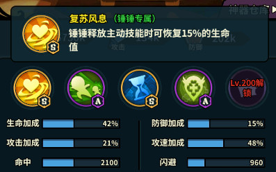 别人的专属神器是增加数值,锤锤的专属神器直接增加回血机制,并且这个技能算是被动回血,不被光战等克制。锤锤神器大概在开服一月后的活动可以氪金获取,大概180块。不确定返厂日期。由于闪避数值需要超过一定阈值才会有明显给感官提升,所以在极限推图中还是建议闪避优先,CD刀不推荐。