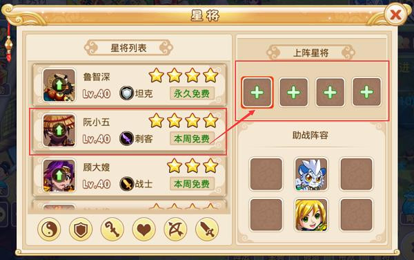 这里显示全部星将,包括不同等级、不同职业、解锁与否、免费与否(不免费不可上阵)。