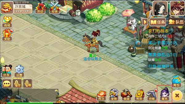 右上红框是上阵星将操作界面,操作流程是先点任一“+”的图标,这时带“+”的框框会变成红色框框,然后点左边想要上阵的星将就可以了。