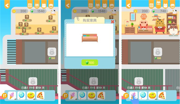4、解锁了第一个房间的家具后,小动物们也纷纷入住了进来。之后可以拖动下方的食物到小动物身上给它们喂食,把食物拖到小动物身上后需要停留一会。小动物吃完后可以给我们金币奖励,还可以增加亲密度用于升级。
