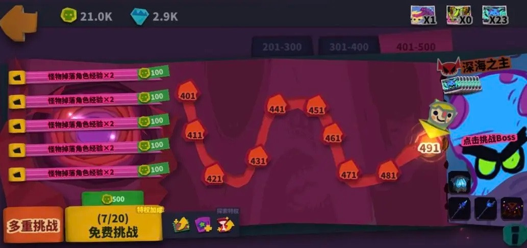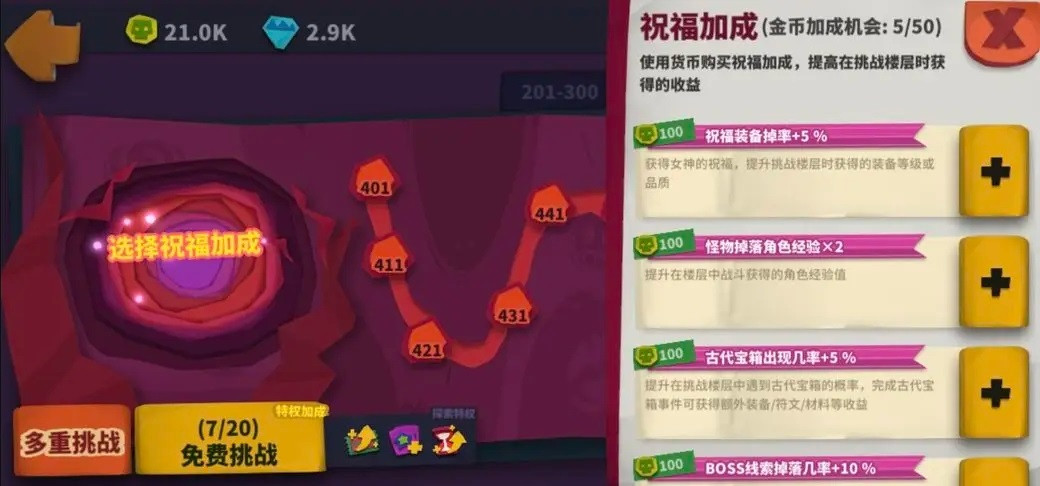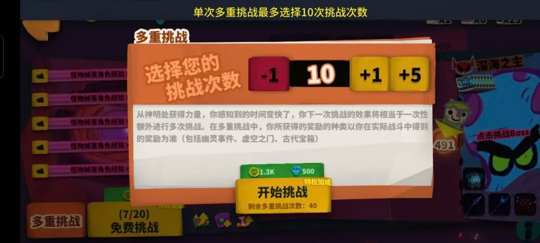 然后是多重挑战:只有在通关了210层以后,多重挑战的图标才可以选中。