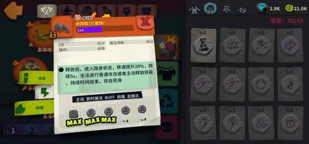 鞋子选择:如果运气好,在随机商店刷新出来迷踪鞋,就做出来用,符文全部带buff持续时间提高,因为前期,肯定做不到无限隐身,也升不了太高的符文等级,全部带buff持续时间提高,打boss的时候开一下,打桩就好。