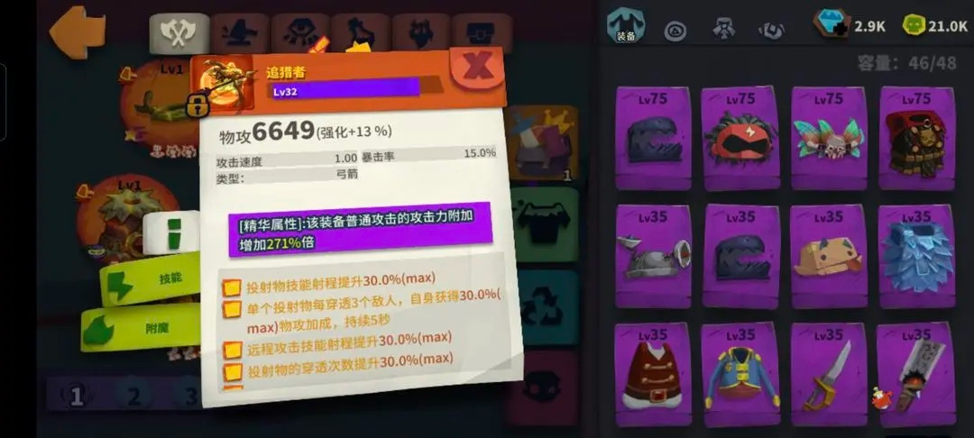 使用攒的狗粮,直接把追猎者升级至紫1。通过技能介绍可以看到,投射穿透可以增加追猎者的伤害,所以符文搭配为:五个投射穿透、一个增加射程。符文全部升级到最少三级。
