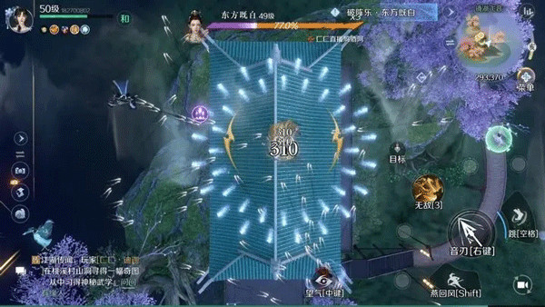通过地面阶段后就是飞天阶段,时刻注意躲避技能,不断调整自身位置。上天以后除了正常射出音刃攻击外,记得使用获得内力屏障技能,有3秒的无敌时间,此外燕回风也能够无敌0.5秒,副本过程中需灵活运用。