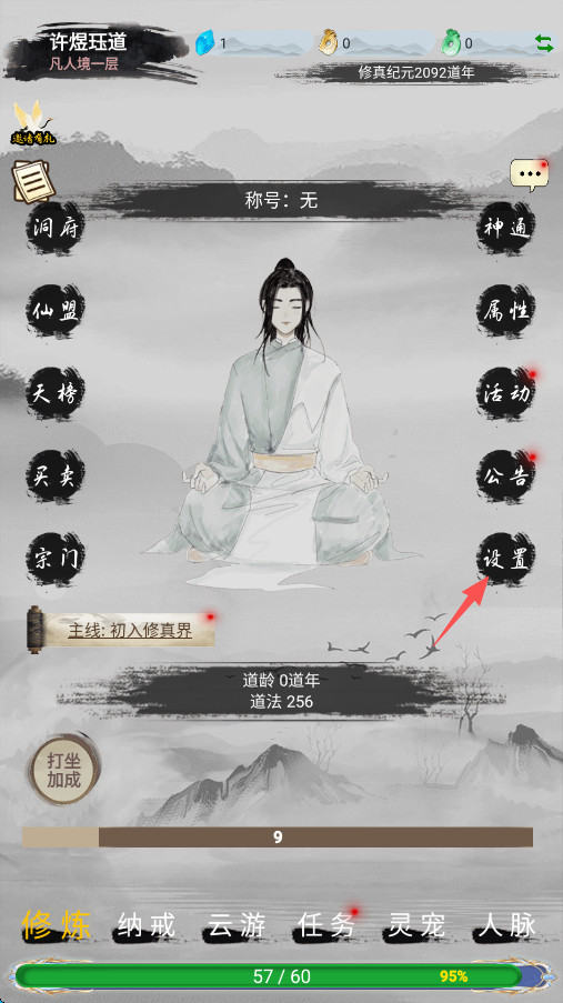 1、在“修炼”界面,点击屏幕右侧的“设置”。