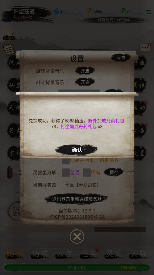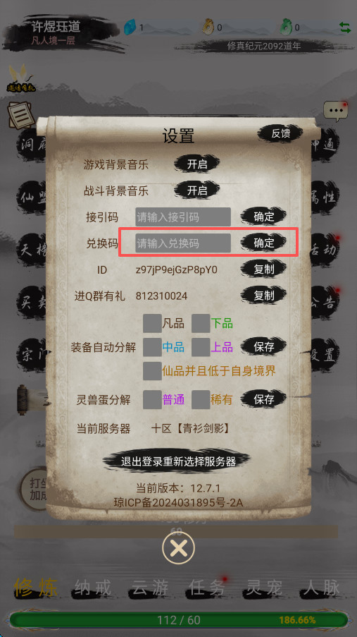 2、点击“兑换码”右侧的输入框,输入兑换码(shenmo666、xinshou、xinshou666、apple、taptap、haoyoukuaibao)后,点击“确定”。