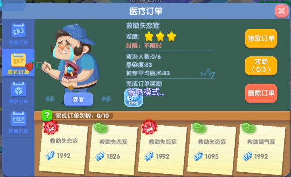 玩家等级达到10级以后就可以通过点击医院门口宣传栏接医疗订单任务,如果你医术值足够高,建议接难度5星订单特别是医疗订单中的成长订单,如果不是5星订单你可以通过删除订单刷新订单。