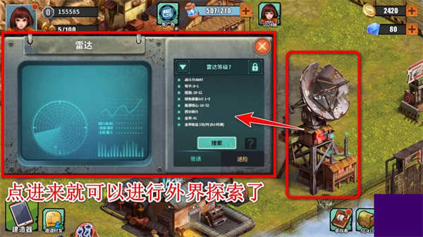 6、我们要知道生存是至关重要的,探索外界,击败僵尸也是日常的一环,在雷达这里点击探索。