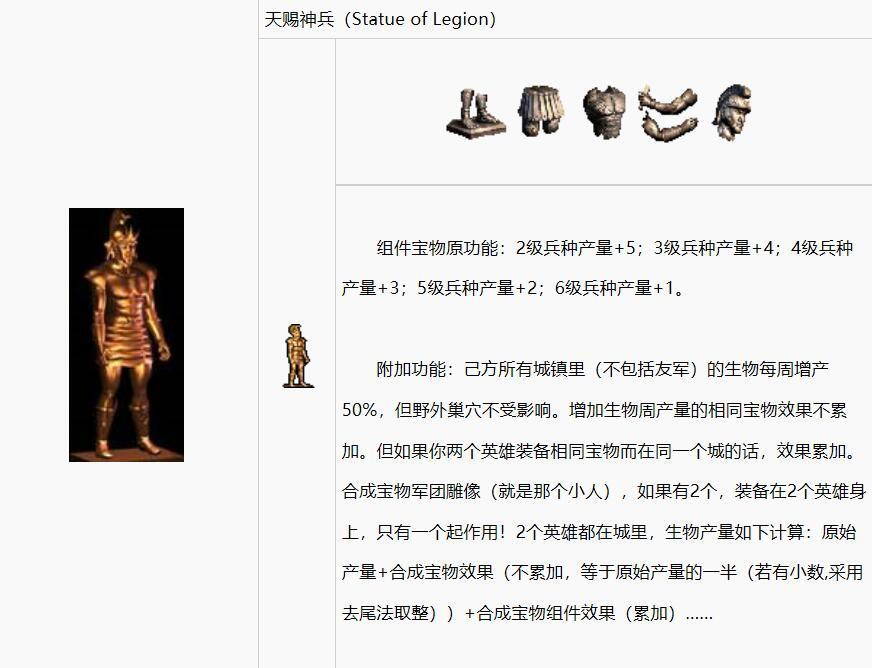 附加技能:己方所有城镇里(不包括友军)的生物每周增产50%,但野外巢穴不受影响。增加生物周产量的相同宝物效果不累加。但如果你两个英雄装备相同宝物而在同一个城的话,效果累加。后勤类的超级神器,想要快速拥有更多的部队,必不可少的超级宝物。