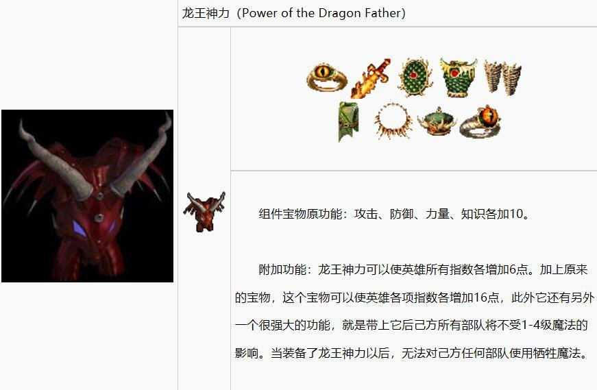 附加技能:英雄佩戴龙王神力之后,部队将不再受到任何1到4级魔法的影响,并且还能额外提供6点所有属性,加上宝物原本的10点所有属性增加,实际上可以增加16点所有属性。值得一提的是,佩戴龙王神力之后,将不能对己方单位使用牺牲魔法。在敌人多魔法伤害时,效果超级棒的哦。
