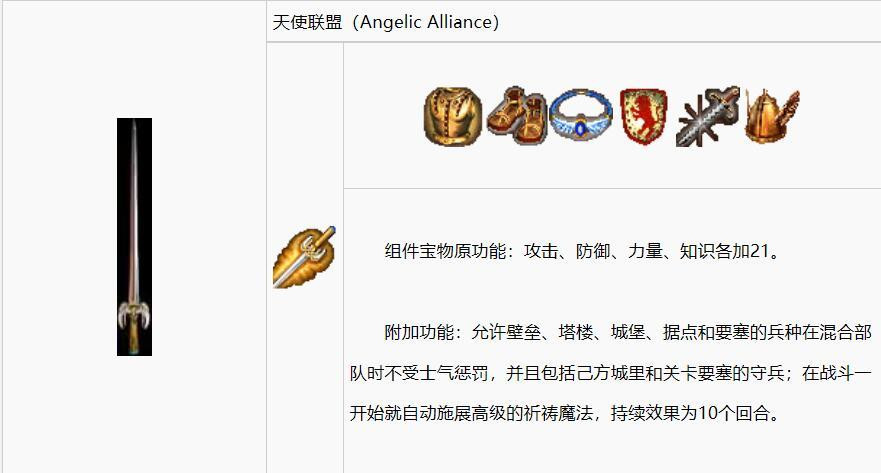 附加技能:战斗一开始自动释放可持续10回合的高级祈祷魔法,并且无论是英雄自身还是要塞守兵都不会因为壁垒、塔楼、城堡、据点和要塞的兵种混搭而受到士气影响。算是所有喜欢多种族混搭部队的玩家最理想的组合宝物。
