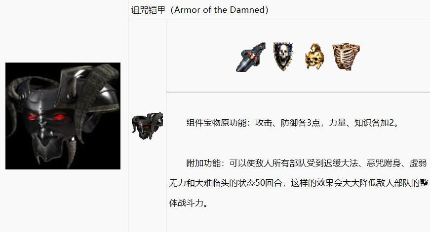 附加技能:可以让敌人与自己作战时,直接受到多种负面魔法作用持续50回合。负面魔法包括迟缓大法、恶咒附身、虚弱无力和大难临头。虽然属性提升较低,但受到四大负面魔法影响的敌军战斗力将大幅度提升,在面对无法免疫负面魔法的敌人时效果出奇的好。