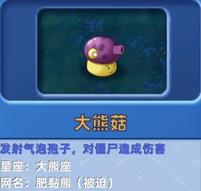 大熊菇:发射气泡孢子子弹攻击4格范围内的僵尸,具有10%的概率发射毒气泡孢子子弹,使目标区域内的所有僵尸陷入中毒状态。