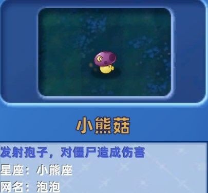 小熊菇:发射孢子子弹攻击3格范围内的僵尸,具有10%的概率发射毒孢子子弹,使目标僵尸陷入中毒状态。