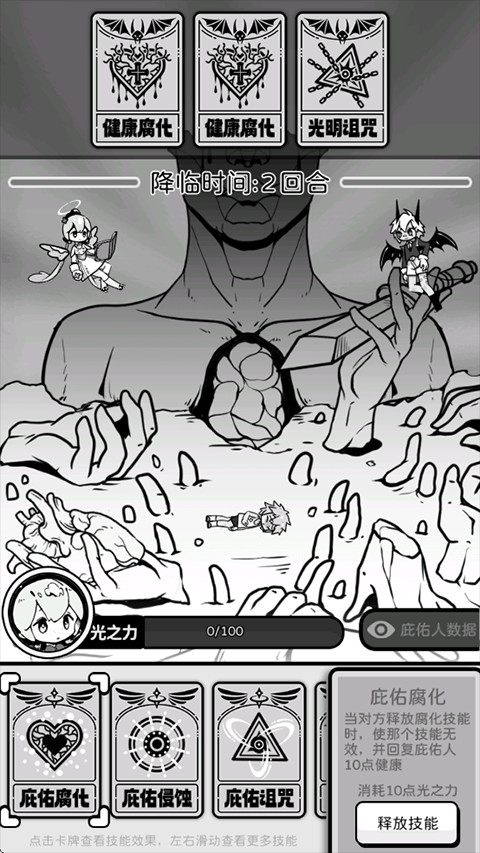天使模拟器是一款独特的黑白画风角色扮演游戏,玩家将化身为来自救赎部的天使,在光与影交织的世界中执行救赎任务。天使模拟器以卡牌系统为核心,通过策略选择和命运干预展开游戏。玩家需要在各类事件中保护短命之人免于死亡,延续其生命,以此获得更深的救赎回馈。天使模拟器游戏以回合制对战、卡牌搭配和剧情选择构建出极具代入感的体验,每一次任务都充满不确定与挑战,让玩家在神意与自由意志之间寻找微妙的平衡。