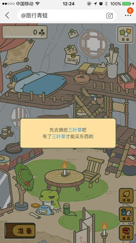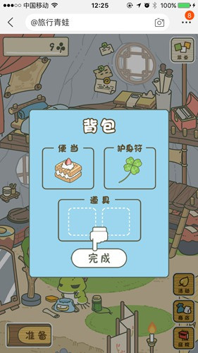 4、然后我们点击右下角的“小屋”返回房间里,在房间里点击左下角的“准备”按钮,开始为青蛙准备旅行的行李。点击行李中空白区域,放入便当、护身符等,就可以点击完成了。然后我们的青蛙就开始出去旅行了。