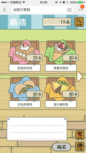 3、有足够的三叶草后,我们点击屏幕右下角的“商店”按钮,进入商店,可以看到有很多食物便当,用三叶草购买一个便当。由于三叶草数量有限,所以我们第一次只能买第一个10个三叶草的便当。