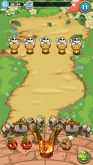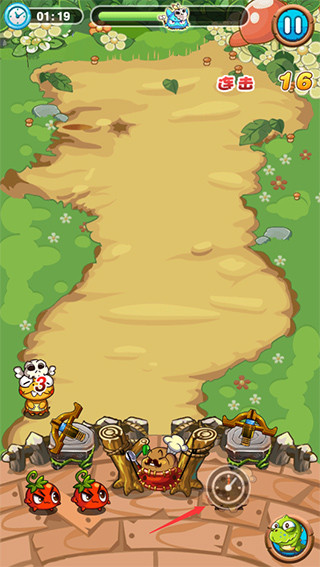 5、玩家依然只需通过滑动屏幕来控制弹弓将小蔬菜弹射出去攻击敌人。