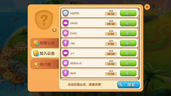 在关卡页面点击左下角问号,查看可加入的公会列表。