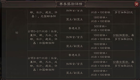 游戏以赛季为主,一个赛季大概历时3个月左右。在这段时间里你得先征服郡,然后再征服州,最后征服群雄取得中间的洛阳,谁拿洛阳谁便能称王。赛季结束后会根据同盟占领城池的情况来发放奖励,同盟占领的州府越多,奖励也会越丰富。