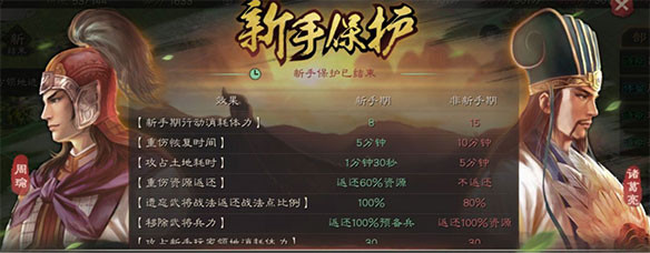 新手期期间,占领时间缩短、武将出征体力减少、移除武将兵力会返还预备兵、遗忘战法返还所有战法点。这个时间段非常适合开荒和练级,不仅能节约更多时间,还能更加效率。所以主公一定要把握好新手期噢,在这段时间里多肝点