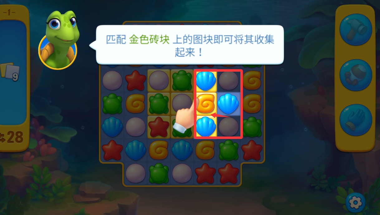 2、进入游戏把同颜色的贝壳移动到一起进行3消。