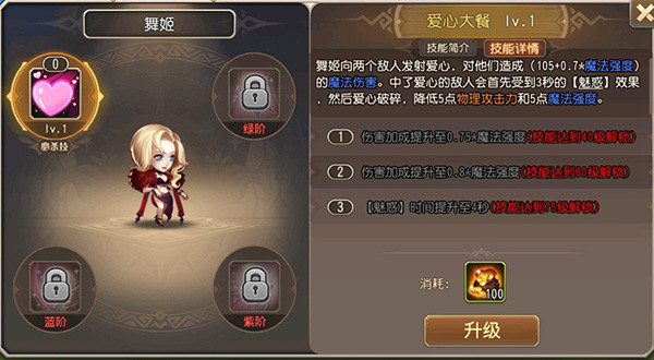 爱心大餐:舞姬对两个敌人发射爱心造成魔法伤害和魅惑效果并降低物攻和法强。