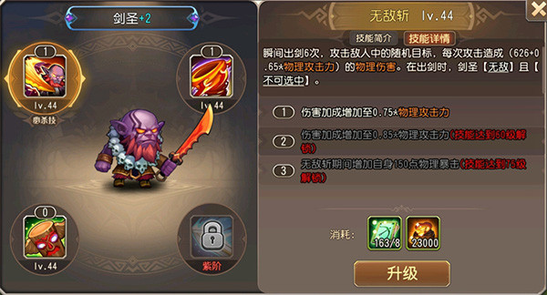 无敌斩:瞬间出剑6次,攻击敌阵中随机目标。因为速度太快,没有人在施放无敌斩期间击中剑圣。