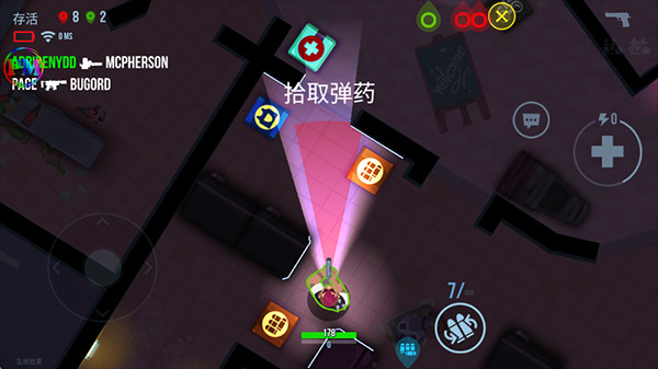 游戏中有多种武器和道具可供选择,不同枪支的射击范围和效果不同。战斗区域内散落着各式可拾取道具,如子弹、护甲、医疗包、升级包等。