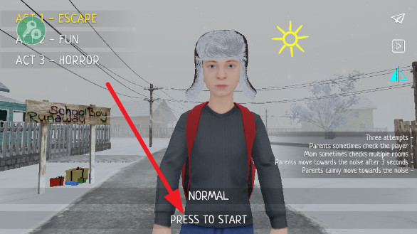 逃离家暴手机版(SCHOOLBOY RUNAWAY)围绕一名名叫Max的学生展开,讲述他在厌倦学业压力后选择离开家庭并踏上逃离之旅的故事。玩家将跟随角色在不同场景中不断推进剧情,面对形形色色的角色与情境,从街头表演者到奇特的互动人物,逐步体验一段充满变化的冒险过程。逃离家暴手机中文版下载后,游戏以轻松幽默的叙事方式贯穿始终,在趣味场景与角色互动中展现独特风格,同时通过剧情发展引导玩家思考选择与结果之间的关系。