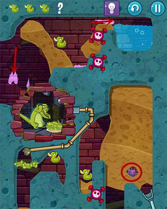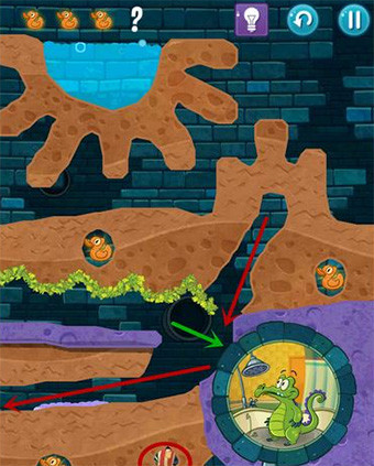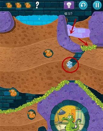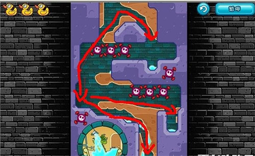 游戏中多了鸭子,我们不但要引水,还要把鸭子送到鳄鱼宝宝的浴缸里去,让宝宝开心。路线我以及截好图,看下面。