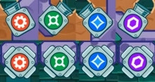 当水,毒水,泥浆或水蒸气碰到开关时同色的挡板(或风扇、吸水器)会触发某些事件。有2种开关:第1种是筒状的,不可关闭,触发会消耗1滴物质;第2种四周有按钮,有物质接触打开,物质移开则关闭。第2种开关也可以用气球打开。