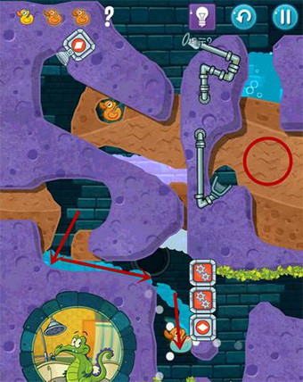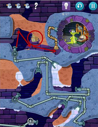 继续分支,让水管先冲洗鸭子,路线如下图。接下来的是利用2个腐蚀性的物品,打开爆炸,让水借助冲力到达鳄鱼那里即可。