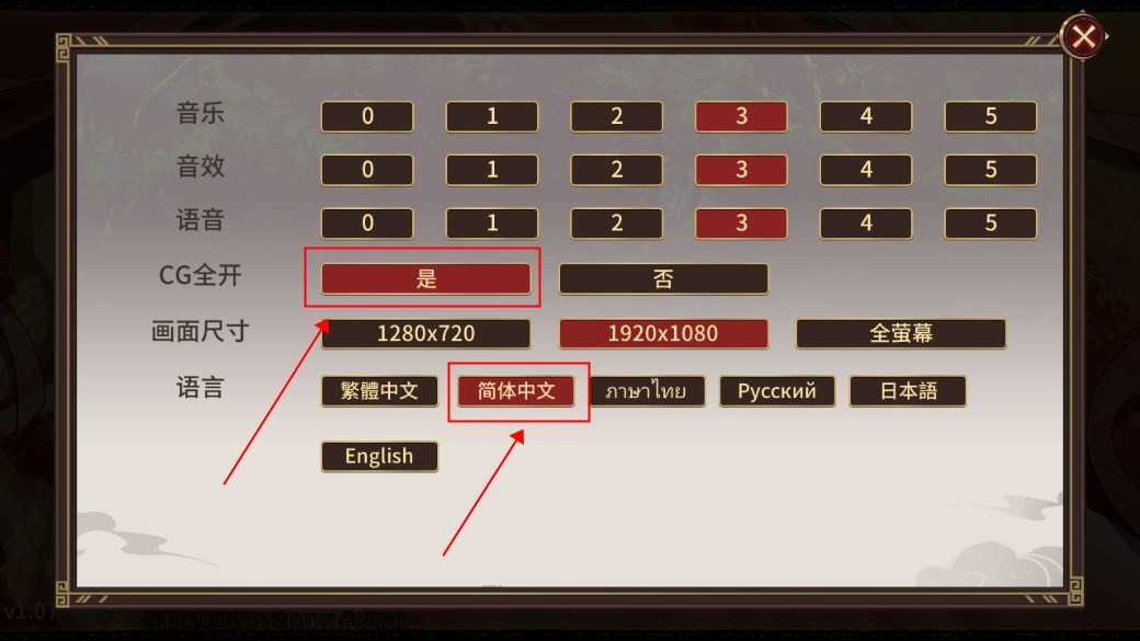 2、进入到游戏设定之后,在这里我们就能看到CG全开和语言设置选项了。