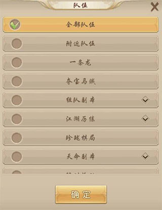 打开组队平台后,可以查看到当前游戏里所有队伍的组队情况,并按队伍目标做了细分。例如:一条龙(包含当日所有能参加的副本)夺宝马贼,珍珑棋局,组队副本(老三环,燕子坞,四绝庄,缥缈峰等),镜湖,天命副本,江湖历练(包含野外,古墓,地宫挂机),以及限时活动队伍等。