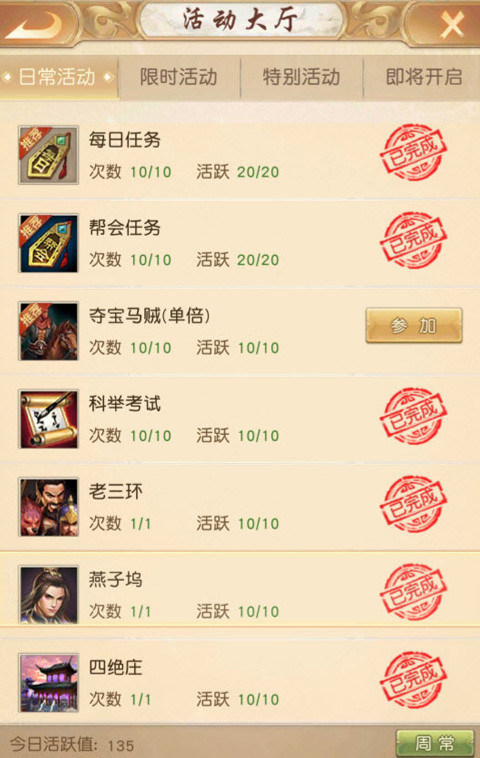 然后就是限时活动,如每天晚上七点一次的帮会行酒令和练功,每天的珍珑棋局,每周的跑环任务,每周一次的蹴鞠、演武场,这类活动获得经验。这里要说一下,如果选择一个好点的人多的帮会,超过12人一起在线能吃满行酒令的经验,低于的话就没有满经验加成了,练功最好组相差10级以上的,得的经验会多些