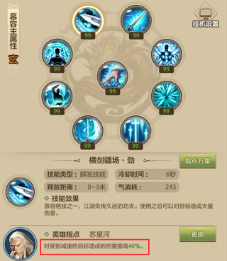 苏星河指点后可以使得横剑疆场技能对减速目标造成提升40%的伤害,慕容门派具有减速技能星河虹吸和破天式,所以只要慕容少侠控制释放技能的时机,是很容易为目标加速减速效果的,打出140%的伤害不成问题,在PK时候有一点的作用。