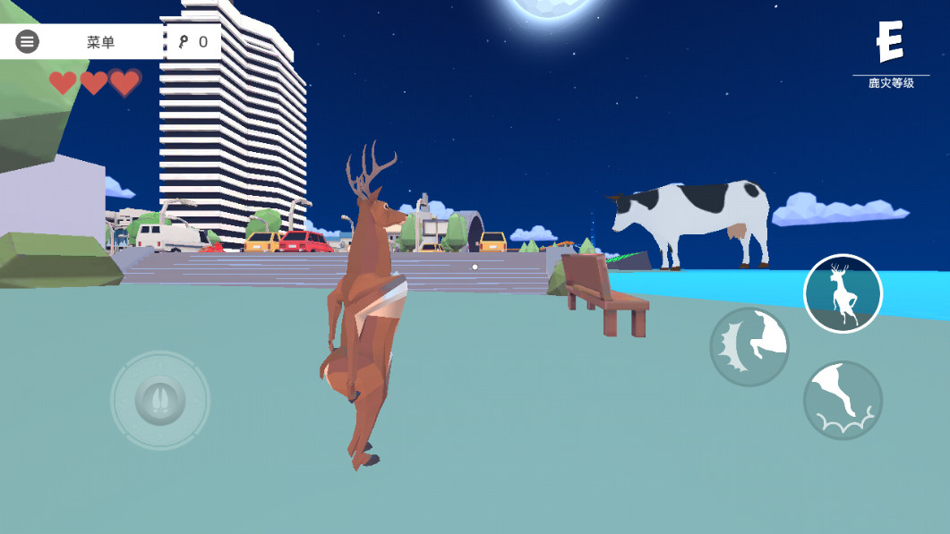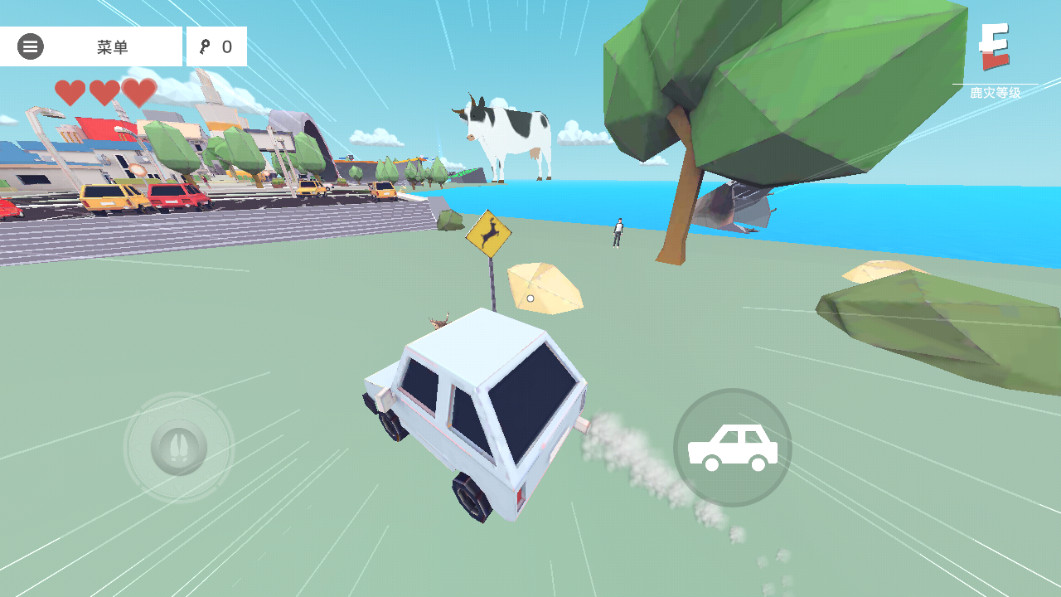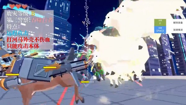 5、玩家可操纵鹿进行破坏,以此提升右上角鹿灾等级,每提升一级可获得新武器,以及解锁新敌人;