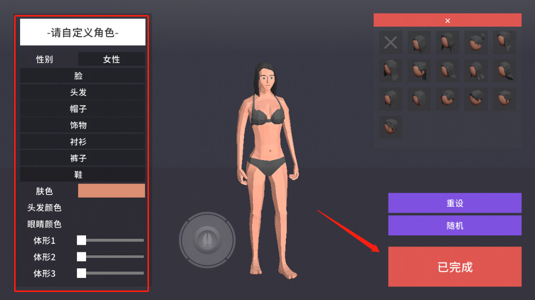 2、然后玩家需要自定义角色,点击人旁边的圆形图标,可以全方位查看角色,设置完以后点击右下方的【已完成】;