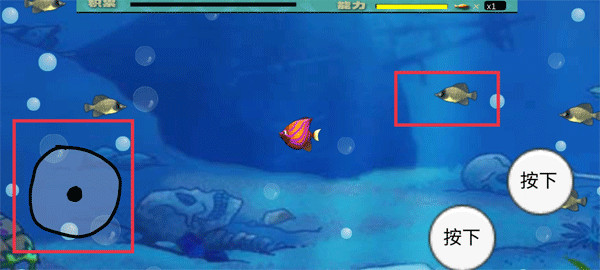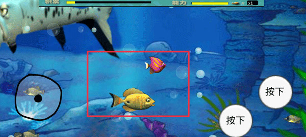 1、游戏中通过左侧的摇杆控制移动,不断难度去吞噬其他的小鱼,这样就能积累自己的经验条,满了就能进化。