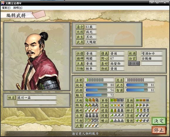 4、清州之町,泷川一益,推荐原因:足轻3级,铁炮4级,忍术3级,算术3级。喜爱南蛮物;