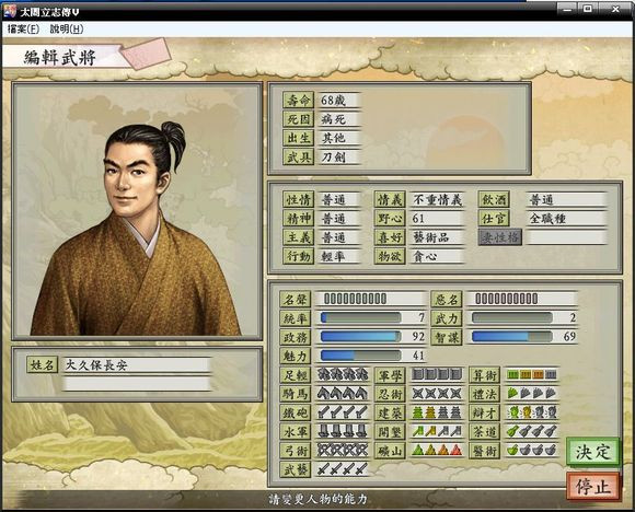 2、甲府之町,大久保长安,推荐理由:4级矿山 92政务,跟伊奈忠次简直绝配,喜好艺术品,直接喝茶,内政型;