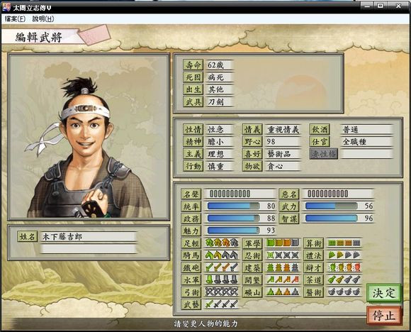 5、清州之町,木下藤吉郎,推荐原因:政务88,智谋96,魅力93,足轻3级,铁炮3级,军学3级,建筑3级,开垦4级,矿山3级,算术3级,辩才4级。喜爱物:艺术品;