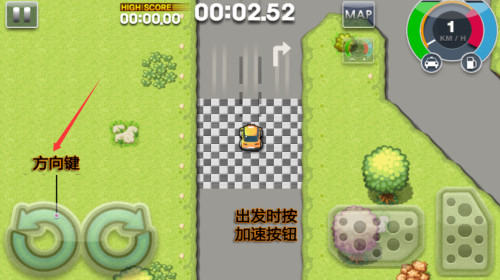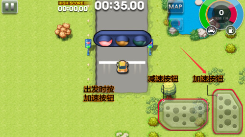2、按下红框箭头指向的红色加速按钮,启动赛车。
