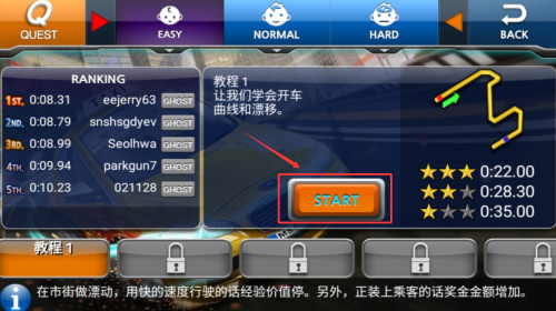 1、点击红框箭头指向的橙色START按钮,开始漂移练习。