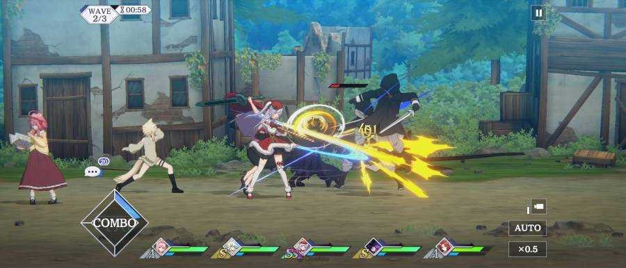 3.战斗系统相当简单,开始后会以半自动的形式展开(新手教学结束后可直接全自动+两倍速),随着与敌人一来一往的自动攻击,可使用画面左下随机选出3人、根据先后顺序附加越来越多Buff的 Strike Combo 技,或是各角色的必杀技。 另外,通关后可以开启扫荡机制,加快等级提升的速度。