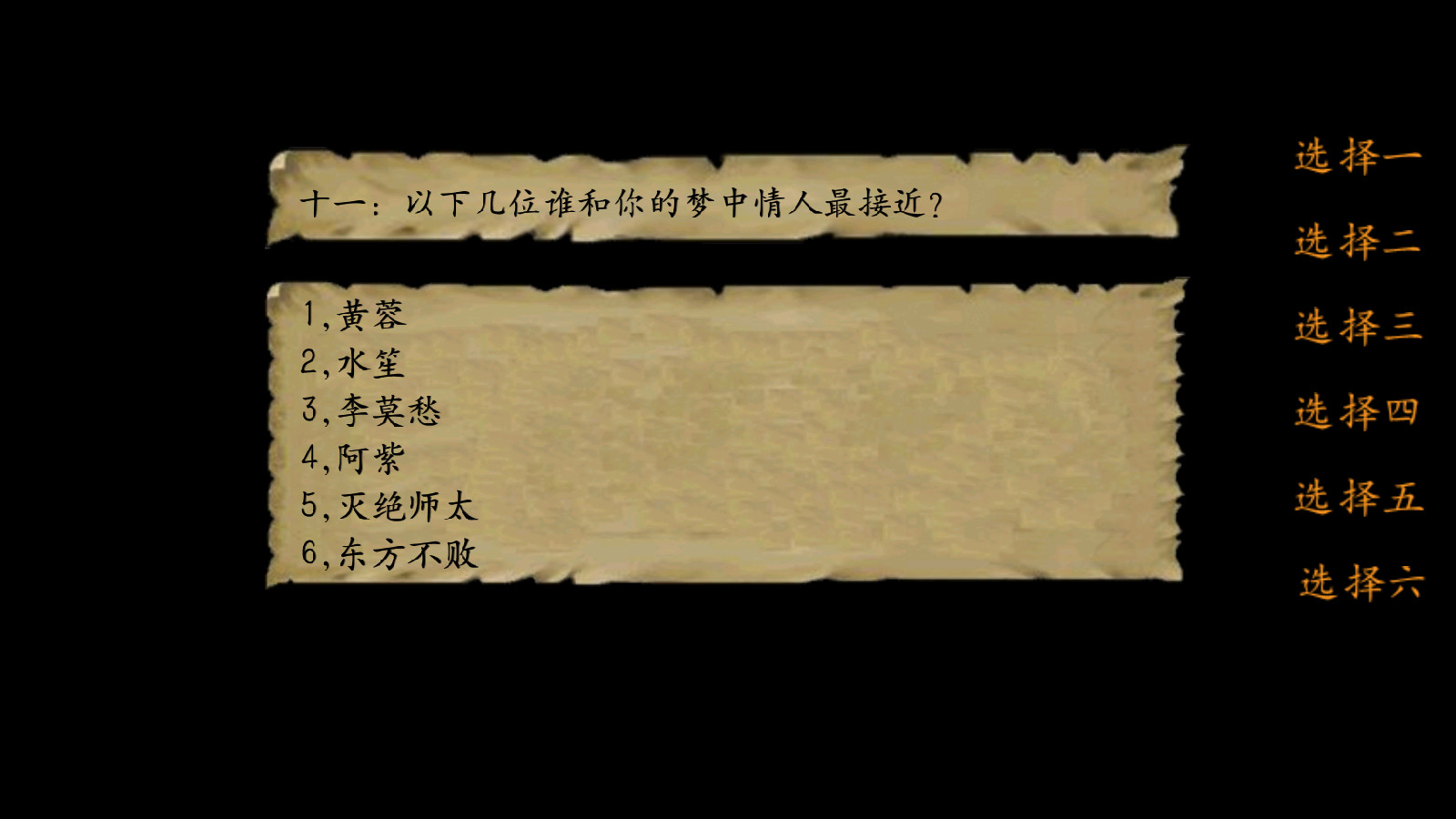 6.东方不败(好感度增加,建议选这个。选东方为梦中再灭日月神教就可以领取东方mm一枚,属性彪悍)