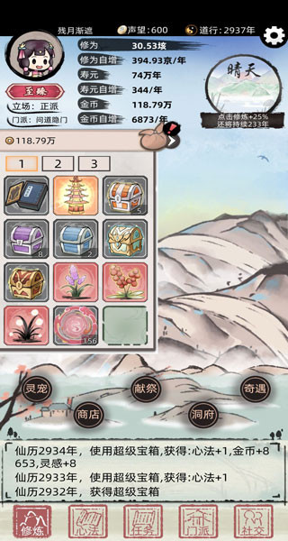 2、融合修仙元素,从天赋、法宝到丹药,形成一个完整修炼体系,让角色成长路径极具个性。