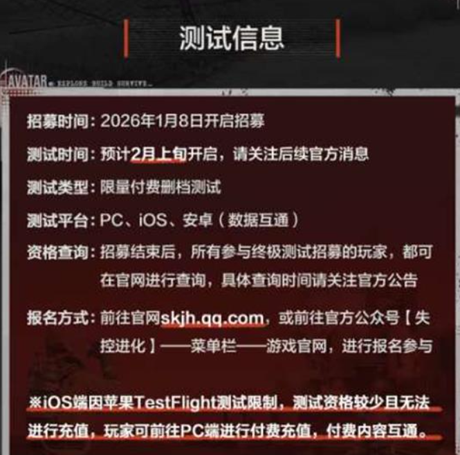 《失控进化》官方宣布终极测试招募活动已正式启动,预计测试将于2 月上旬为玩家们开启。此次测试为限量付费删档测试,玩家可通过官方网站或各大游戏平台报名参与。借此,测试将覆盖PC、iOS 和安卓平台,并支持数据互通,为玩家提供多端畅玩体验!